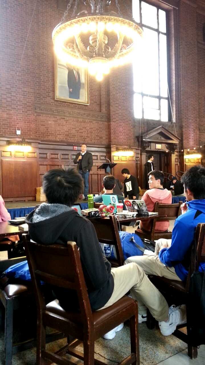 Andrew and I made the journey once again to New Haven, CT to attend Yale Univerity’s hackathon, YHack. This time around, Andrew drove, so we thankfully avoided the chaos of public transportation (unlike last year). YHack began Friday night with a meager opening ceremonies that seemed slightly rushed due to the threat of rain, as we were gathered outside in a courtyard. Andrew and I found a great office in which to spend the weekend hacking, complete with two large desks and a window view. We met up with a few other friends from RPI as well.